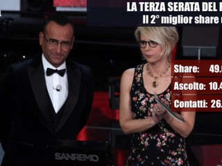 Il cumulativo è molto positivo. Soprattutto per i contatti, con 26milioni e 440mila italiani che si sono alternati. “Un dato molto alto. Il secondo miglior share dal 2005. La media cumulativa delle serate fino ad oggi è al 49% lo share mentre l’ascolto medio porta a 10milioni 718mila i telespettatori, mentre i contatti salgono a 35milioni 248mila. Manca uno 0,1% rispetto all’anno scorso che è il migliore”.