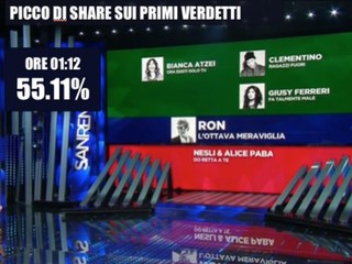 Il Festival unisce il paese dal nord al sud passando per le isole. Un picco si è registrato in Puglia, è la regione che registrato i dati più alti, raggiungendo il 58%. Il picco di ascolti è stato raggiunto con l’ostetrica Maria Pollacci alle 21.51, c’erano collegati 15milioni e 600mila telespettatori. Mentre il picco di share è arrivato a l’1.12 con i nomi degli eliminati, il dato era al 55.11%”.