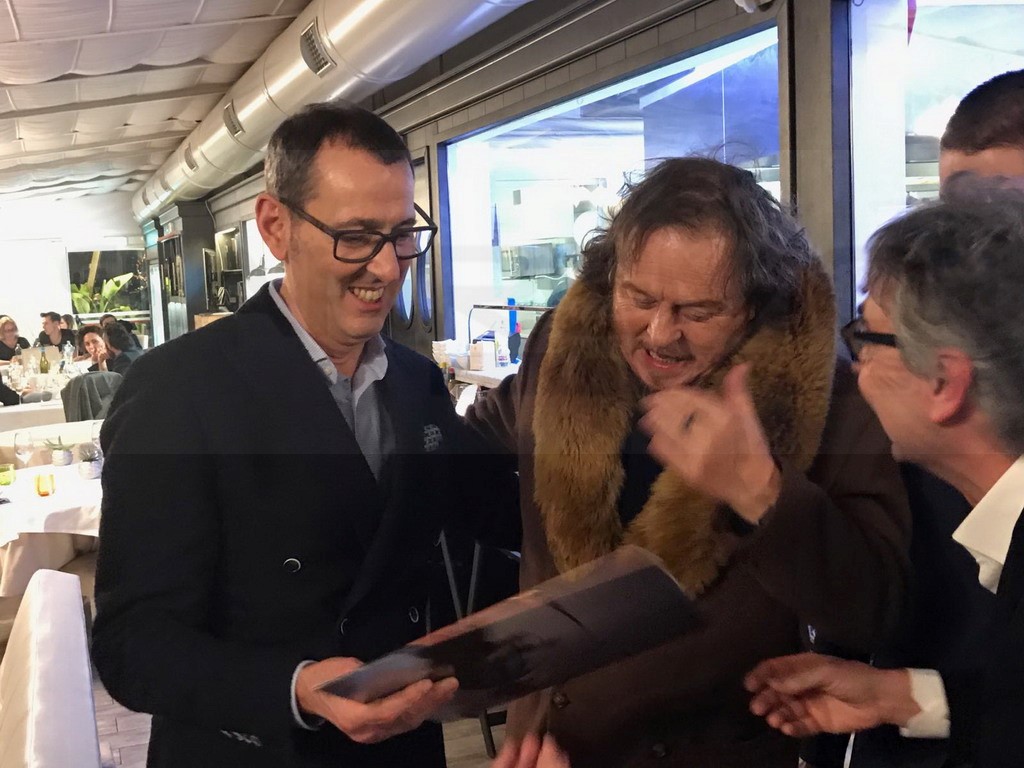 Ha cenato insieme al suo staff, gustando le prelibatezze proposte dal locale. Alla fine non sono mancate le foto di rito e, uno dei titolari, l’ex caporedattore del Secolo XiX Roberto Berio, ha anche tirato fuori un disco mix degli anni ’80, ‘Rispetto’, che custodisce nella sua collezione privata.