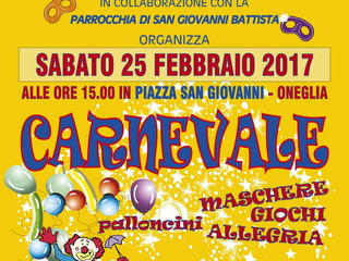 Sabato 25 febbraio prossimo, alle ore 14.30. si rinnoverà l'appuntamento in piazza San Giovanni, nel centro storico di Oneglia, con il ‘Carnevale dei bambini‘, dove si saranno il duo Marbella & Fortunello che animeranno il pomeriggio in maschera: giochi, baby dance, caramelle, premi a sorteggio e sorprese per i più piccoli. Noi vi aspettiamo numerosi, non mancate !