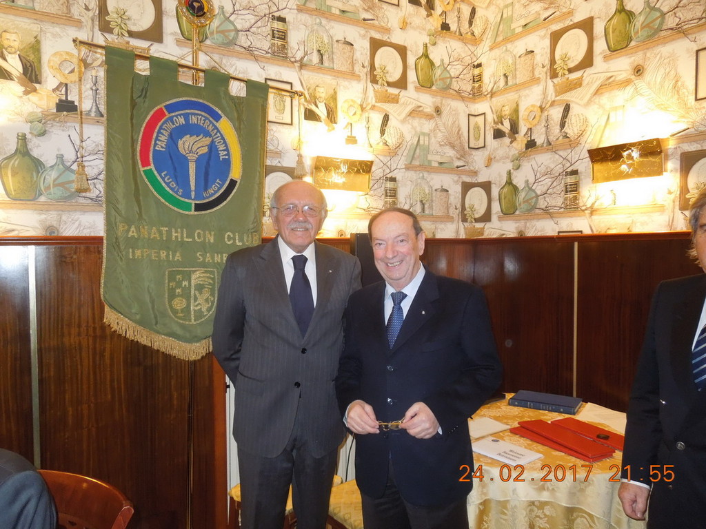 Il Presidente del Panathlon Club Imperia e Sanremo Angelo Masin, dopo un cordiale saluto ai soci, ha presentato quale ospite d’onore il Presidente del C.O.N.I. della regione Liguria Vittorio Ottonello molto apprezzato nel mondo dello sport in quanto è stato in passato un grande atleta. Erano presenti sempre al tavolo d’onore il Capitano di vascello Antonello Alias della Marina Militare comandante della scuola Remiera di Sabaudia centro dove si formano i campioni della canoa e del canottaggio (tra i quali la medaglia di bronzo alle olimpiadi di Rio G.Abbagnale), Matteo Alberti titolare dell’omonima società Latte Alberti sostenitore di molte società sportive imperiesi, Piero Fogliarini con la moglie Giovanna, Franco Agostino Ballestra e Filippo Stella i due nuovi soci che sono entrati a far parte del club.