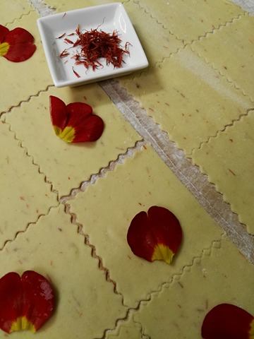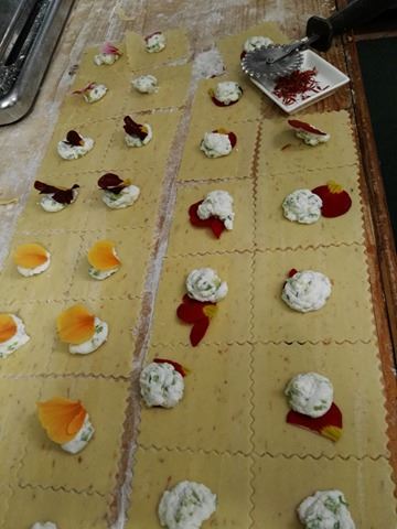 Il menù a sorpresa viene proposto a 25 euro escluso i vini, ma vi offriamo in anteprime qualche immagine della cucina mentre Cinzia prepara dei triangoli con pistilli di zafferano e fiori di primula.