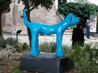 Le opere realizzate in bronzo a scala naturale dall’artista tedesca con base a Lingueglietta, evocano infatti un’atmosfera sospesa e sognante, e popolano una storia i cui protagonisti sono cani, uccelli, giullari, re e ballerine, caratterizzati da tratti essenziali e quasi infantili, con forme scomposte in un giocoso rimando al Dada. I colori sono brillanti e vivaci, dominati da un turchese intenso e “fiabesco”, decorato con dettagli dorati, e disseminati di misteriosi ed evocativi segni grafici.