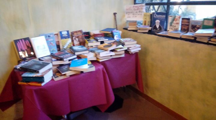 Un angolo per lo scambio dei libri usati in pizzeria. Si trova alla Peperetta Dispetusa di via XXV Aprile a Imperia.