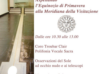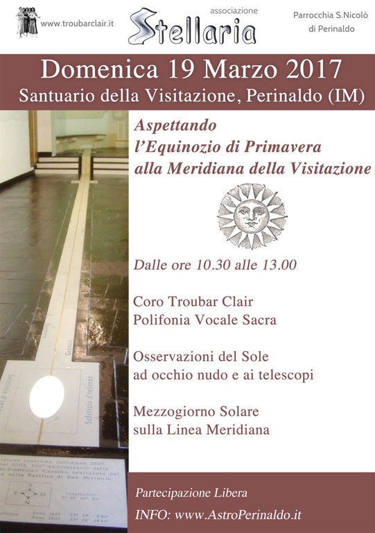 Domenica 19 marzo dalle ore 10.30 alle 13, iniziativa dell'associazione Stellaria presso la Meridiana della Visitazione, alle porte di Perinaldo (bivio per Apricale). Un evento per scoprire l'equinozio di primavera, che astronomicamente cadrà lunedì 20 alle ore 11:28 (ora locale).