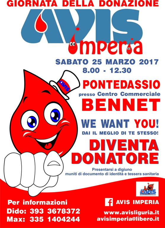 Bennet di Via Nazionale 1 a Pontedassio è in programma la Giornata della Donazione, dove sarà possibile ricevere tutte le informazioni necessarie e Donare il sangue presso un’autoemoteca attrezzata.
