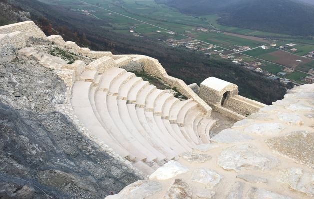 Questo tempio teatro (foto in alto) inizialmente ricoperto di fitta boscaglia fu con in un incendio che ne fece apparire qualche resto; il caso volle che nel 2001 un appassionato di volo, prof Nicolino Lombardi durante un’escursione notasse alcune strutture parzialmente interrate che disegnavano la caratteristica forma semicircolare di un teatro.
