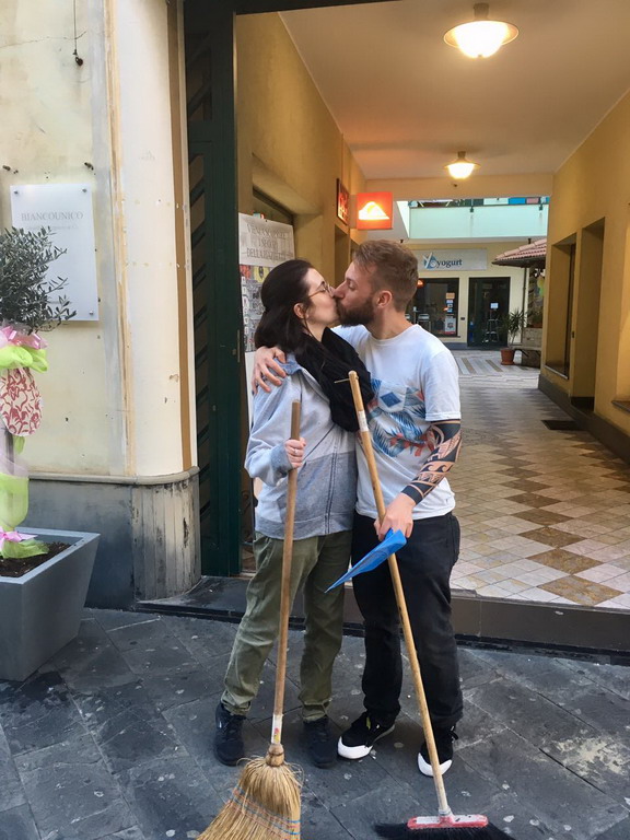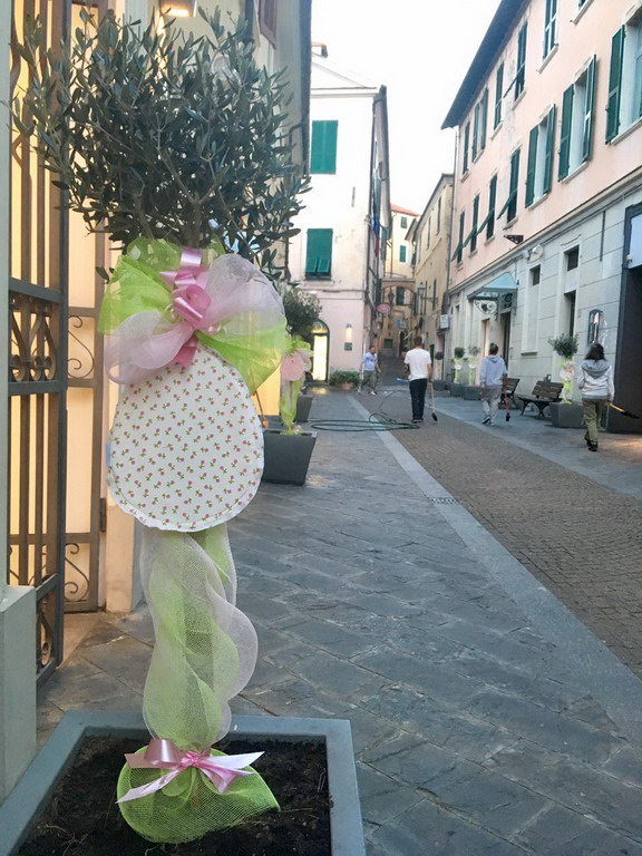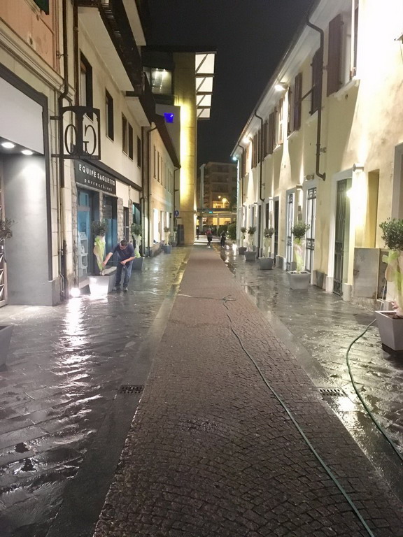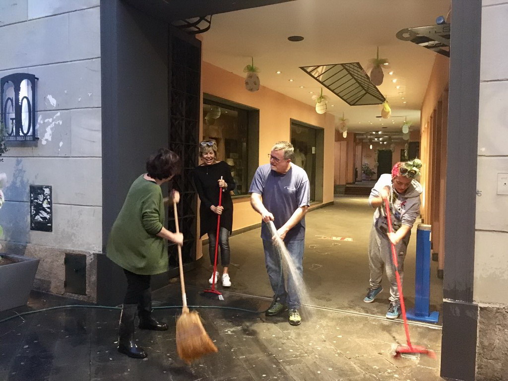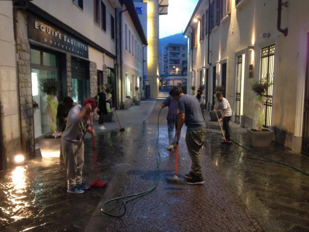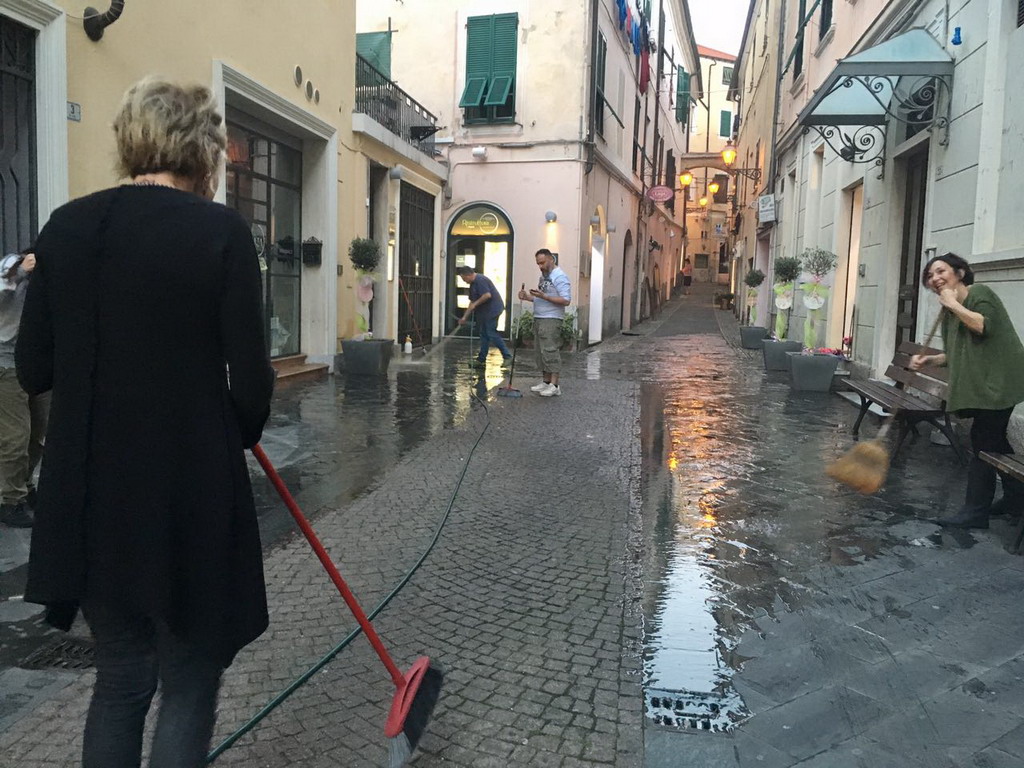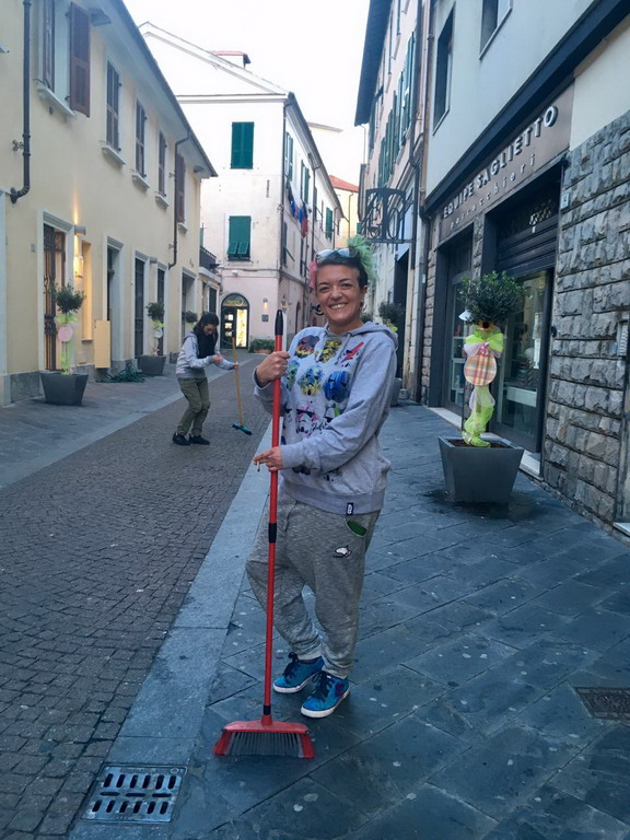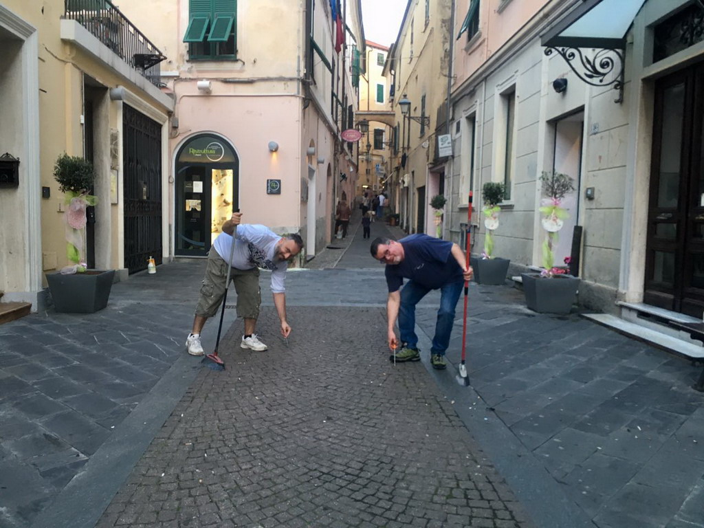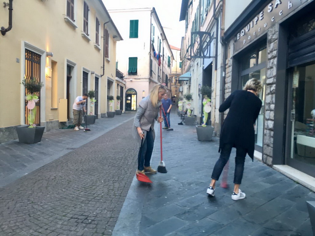 Commercianti all’opera in via Monti, via Vieusseux e Galleria degli Orti a Imperia, nei giorni scorsi, quando, in vista del week end di Pasqua, armati di scopa e paletta hanno tirato a lucido le vie del centro.