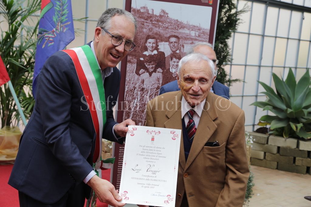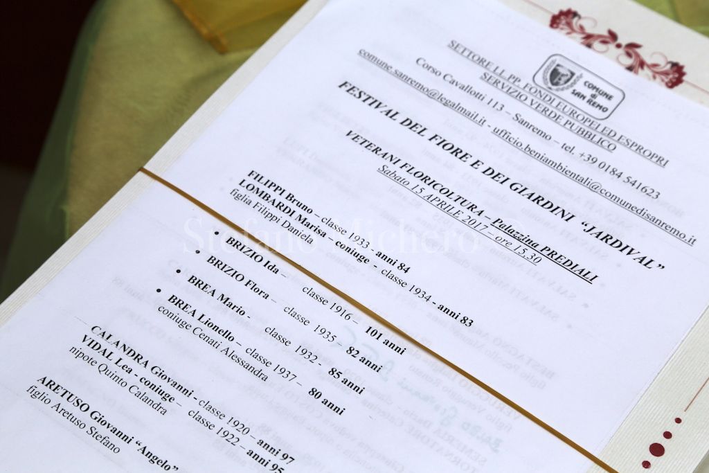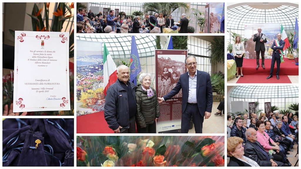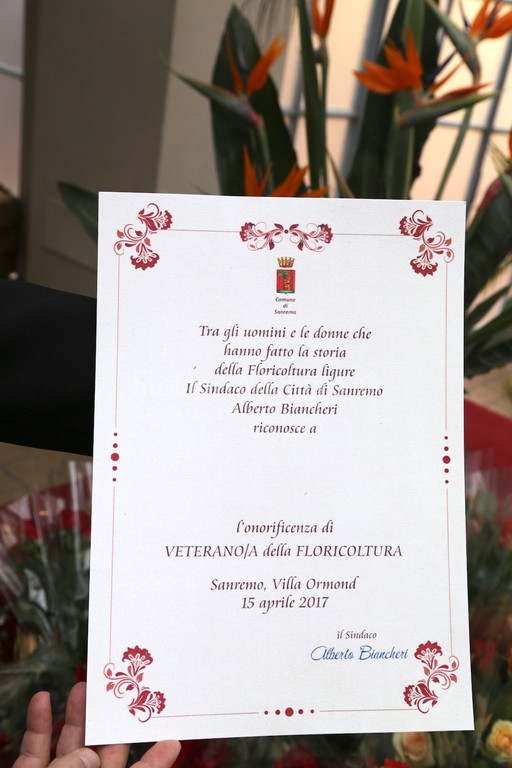 Tutti loro sono i “Veterani della Floricoltura”, donne e uomini nati prima del 1937 e residenti a Sanremo che hanno scritto le più belle pagine della floricoltura sanremasca. L'amministrazione comunale in una cerimonia toccante al Padiglione Espositivo Prediali di Villa Ormond, ha consegnato ad ognuno un attestato commemorativo ed una spilla ricalcante un garofano stilizzato, riprodotto da una creazione grafica dell’ibridatore Ermanno Moro.