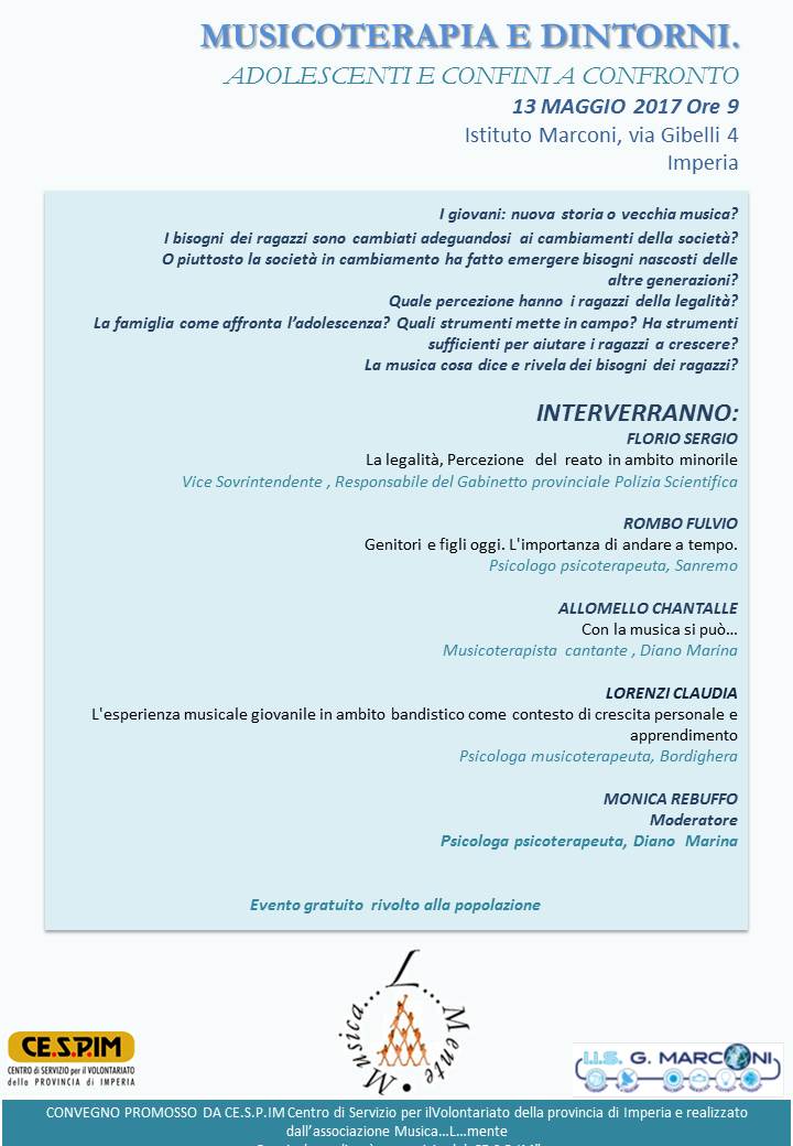 9.00. ‘Musicoterapia e dintorni: adolescenti e confini a confronto’: momento di riflessione intorno al mondo dell’adolescenza con approfondimento sul confine tra legale e illegale, confine generazionale, confini familiari, confini del gruppo di appartenenza. A cura dell’associazione ‘Musica…l…Mente’. Istituto Marconi, via Gibelli 4, partecipazione libera (più info a questo link)