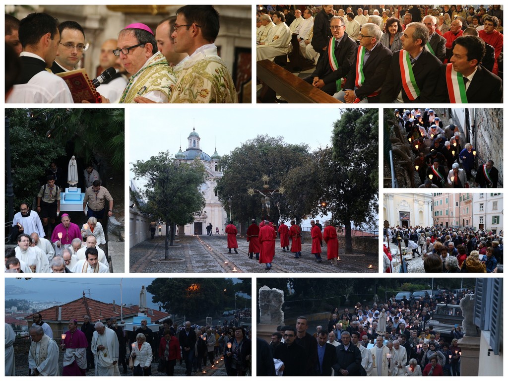 “Questa sera in una circostanza preziosa e solenne, la Chiesa di Ventimiglia Sanremo ha voluto raccogliersi in questo santuario cittadino così caro alla devozione dei suoi fedeli per ricordare nella preghiera i 100 anni delle apparizioni di maria a Fatima - ha detto il Vescovo - lo facciamo sentendoci in profonda comunione con il Santo padre Francesco, pellegrino a Fatima che oggi ha proclamato Santi i pastorelli Francisco e Jacinta che insieme a Lucia hanno ricevuto le rivelazioni di Maria".