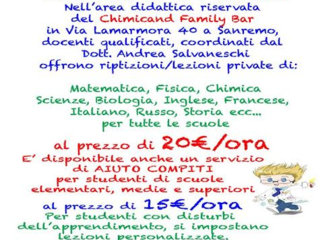 Ma le iniziative per l'estate non finiscono qui, infatti, per tutti gli studenti che dovessero aver bisogno di lezioni private di sostegno allo studio o ripetizioni estive per recuperare i debiti formativi, Chimicand Family Bar metterà a disposizione dei docenti qualificati per ogni tipo di problema.