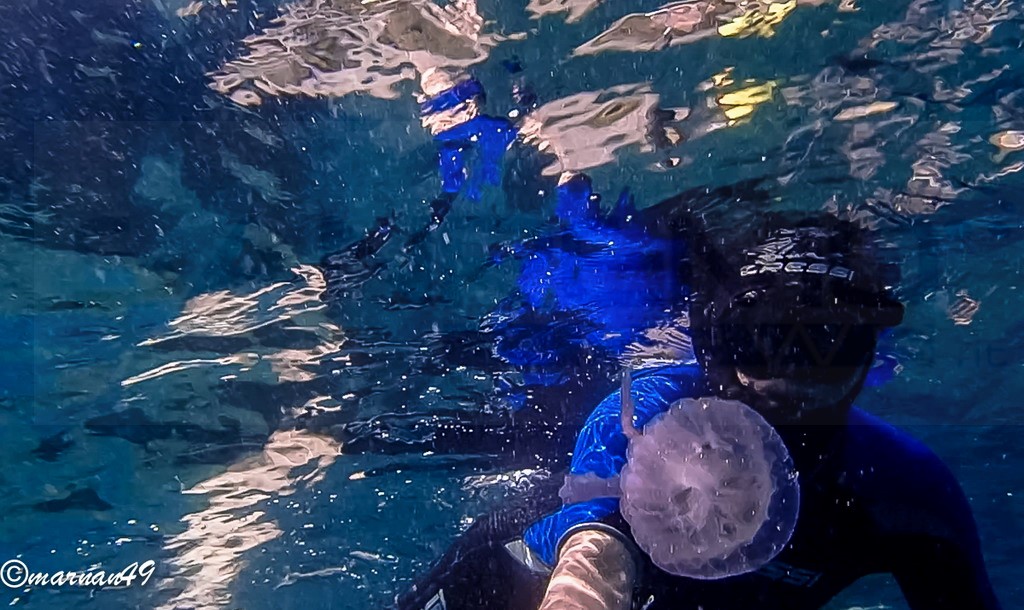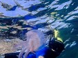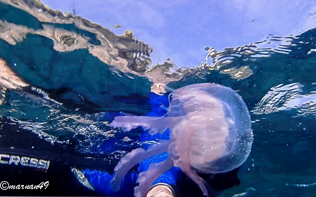Per la sua straordinaria bellezza oggi l'ha fotografata Marcello Nan nel golfo dianese. Le sue dimensioni (a dispetto del selfie che la mette in primo piano) non superano quelle di un pugno, ma è bene evitarla.