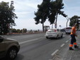 Intervento della Polizia Municipale in via Matteotti davanti al comune per lo sversamento di olio, probabilmente da un'auto che ha avuto un guasto.