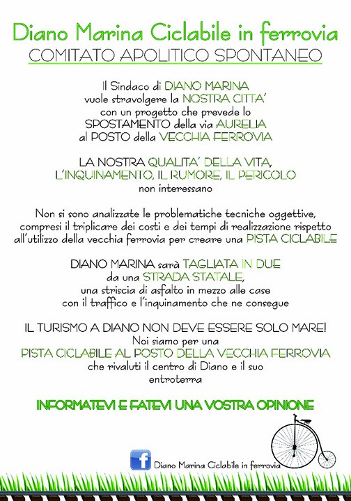 "Noi siamo per una pista ciclabile al posto della vecchia ferrovia che rivaluti il centro di Diano e il suo entroterra. Informatevi e fatevi una vostra opinione”.