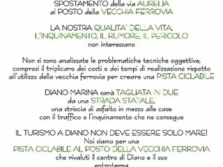 Il testo del manifesto: “Il Sindaco di Diano Marina vuole stravolgere la nostra città con un progetto che prevede lo spostamento della via Aurelia al posto della vecchia ferrovia. La nostra qualità della vita, l’inquinamento, il rumore, il pericolo, non interessano. Non si sono analizzate le problematiche tecniche oggettive, compresi il triplicare dei costi e dei tempi di realizzazione rispetto all’utilizzo della vecchia ferrovia per creare una pista ciclabile. Diano Marina sarà tagliata in due da una strada statale, una striscia di asfalto in mezzo alle case con il traffico e l’inquinamento che ne consegue. Il turismo a Diano non deve essere solo mare!"