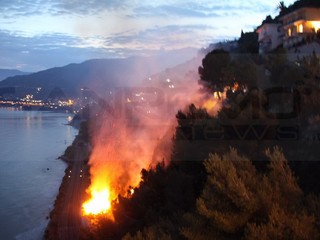 Ventimiglia: incendio alle Calandre, l'opera di spegnimento proseguirà stanotte, ferito uno straniero (Foto e Video)