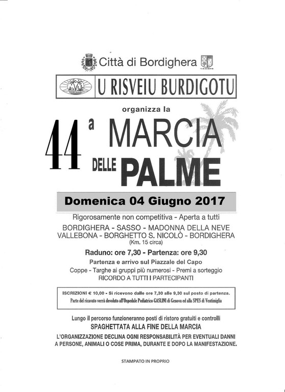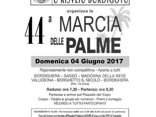 Si correrà domenica 4 giugno 2017, la 44esima Marcia della Palme organizzata dall'Associazione 'U Risveiu Burdigotu'. L’appuntamento è per le ore 7,30 sul piazzale Ottoluoghi (ex Piazzale del Capo). La partenza è alle 9,30 dal punto di ritrovo.