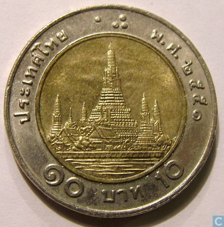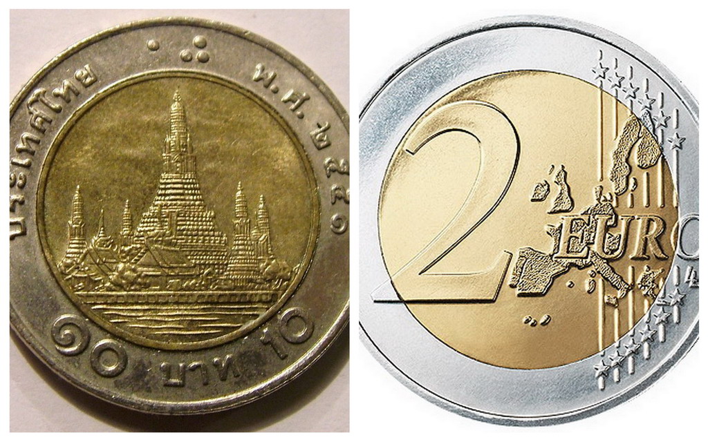 Si tratta delle monete da 10 Baht, una di quelle regolarmente circolanti in Thailandia: stesso colore, stessa dimensione e quasi lo stesso spessore come le nostre monete da 2 euro, ma valgono solo 0,26 centesimi.