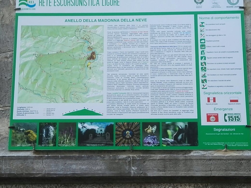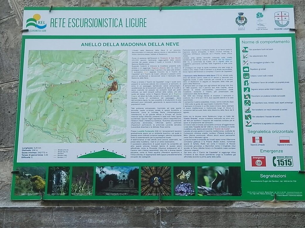 “Dopo un anno di lavoro, tutto volontario, siamo riusciti a restaurare e rendere percorribile, un antico sentiero che dalla chiesa di San Nicolò, che domina l’abitato di Badalucco arriva fino alla Madonna della neve, a circa 780 metri di altitudine. Quindi si ritorna a Badalucco attraverso un altro percorso analogo quasi parallelo. Da questa conformazione viene il nome: Anello della Madonna della Neve. Si tratta di un percorso di poco più di cinque chilometri, con un dislivello tra il punto di partenza e quello mediano di cinquecento metri. Tutto tra fasce con piccoli dislivelli. Senza pericoli. A passo normale ci vogliono circa tre ore di cammino per farlo tutto”