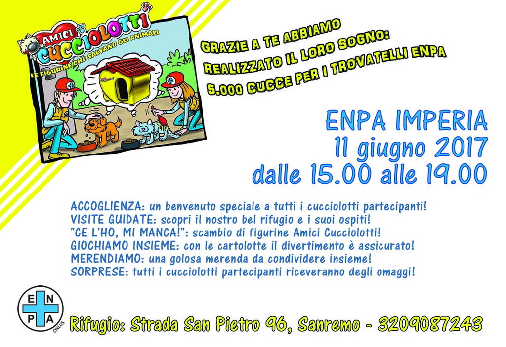 Domenica prossima, 11 giugno, dalle ore 15.00 alle ore 19.00, al Rifugio Enpa di Sanremo (strada San Pietro 96), si terrà il tradizionale incontro per lo scambio delle figurine “che salvano gli animali”. Per conoscere le varie iniziative in programma per questa giornata leggere la locandina in basso.