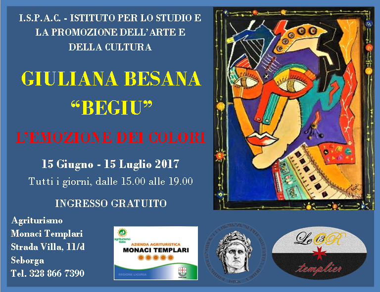 Giovedì, dalle 15, nel bellissimo agriturismo Monaci templari di Seborga inizierà la mostra dell’artista Giuliana Besana, che proseguirà sino al 15 luglio prossimo.