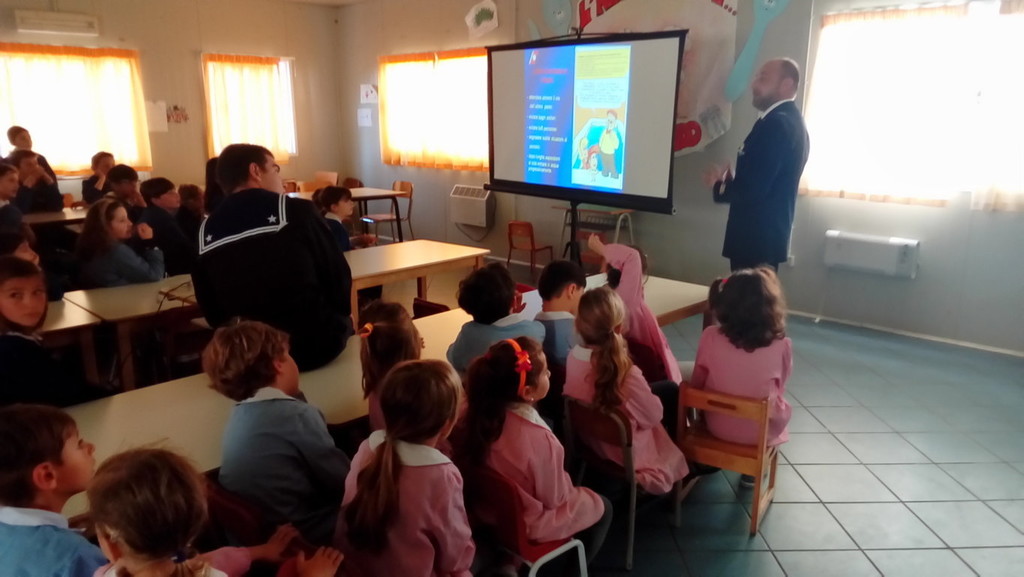 Abbiamo partecipato ad un interessante incontro organizzato dalla Guardia Costiera di Sanremo, al fine di sensibilizzare noi giovani alunni al rispetto e alla salvaguardia dell'ambiente marino e dei suoi abitanti. I due rappresentanti della Guardia Costiera hanno spiegato, avvalendosi di varie illustrazioni e qualche filmato, che è importante prenderci cura di noi stessi e dell'ambiente quando andiamo al mare o in barca. Il maresciallo ci ha consigliato di non fare il bagno subito dopo aver mangiato per non rischiare di sentirci male, di mettere sempre il cappellino per il sole ed evitare di tuffarsi nelle vicinanze di scogli o dove il fondale è basso..Abbiamo imparato che i colori delle boe e delle bandiere hanno un significato ben preciso: la boa rossa per esempio indica che le barche non possono superare quel limite perché potrebbero esserci delle persone che fanno il bagno, la boa bianca indica invece che l'altezza dell'acqua in quel punto è di circa un metro e sessanta ; la bandiera rossa segnala una balneazione pericolosa mentre quella gialla suggerisce di stare molto attenti perché c'è un forte vento.