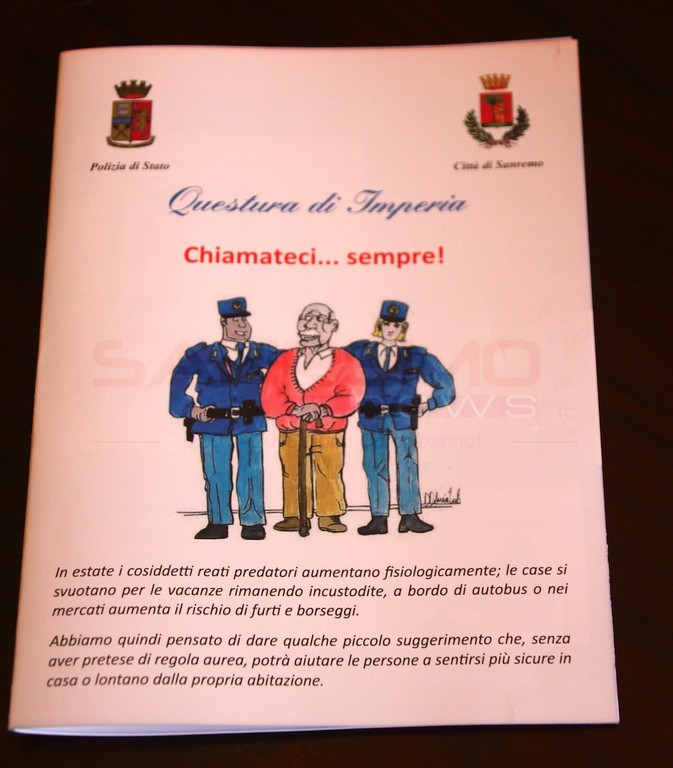 E' stata presentata questa mattina a Ventimiglia, Imperia e Sanremo la campagna informativa predisposta dalla Polizia di Stato, a livello provinciale, volta alla prevenzione di reati predatori: furti, scippi, borseggi e rapine. A presentare la brochure informativa che presto sarà distribuita nei punti strategici e di aggregazione della provincia, il Dirigente del Commissariato della Polizia di Stato Saverio Aricò, insieme al Sindaco di Ventimiglia Enrico Ioculano e di Bordighera Giacomo Pallanca.