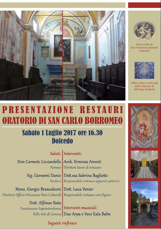 Sabato 1 luglio 2017, a Dolcedo, alle ore 16.30, viene ufficialmente restituito ai fedeli lo splendido Oratorio di San Carlo Borromeo con la presentazione dei lavori di restauro che hanno interessato gli interni nel 2015/2016.