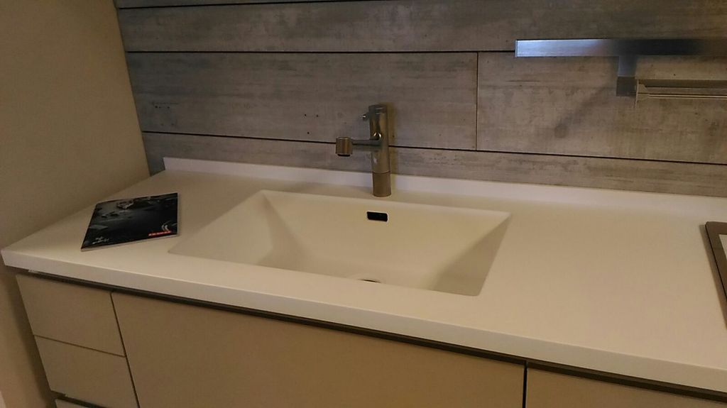 Il secondo, il modello Alevé, dotato di finitura in laccato lucido U.V., introduce nell'universo Gabbiani il mondo degli elettrodomestici della gamma Frames by Franke, novità assoluta per il centro cucine di Sanremo. Frames by Franke è una galleria di elettrodomestici esclusivi di fascia "PREMIUM" che comprende anche il top in solid surface, sempre del marchio Frames by Franke, dotato di grande resistenza, anche al fuoco, di impermeabilità e di rigenerabilità. Se inavvertitamente doveste infatti procurare un qualche tipo di danno, la superficie può essere ripristinata ex novo mediante il semplice utilizzo di una carta abrasiva 00 e acqua. All'interno di questa peculiare composizione troviamo infine un'altra anteprima mondiale: la lavastoviglie AEG COMFORT LIFT, che grazie al meccanismo di sollevamento del cestello inferiore permette una comoda sistemazione di piatti, bicchieri e posate senza doversi chinare.