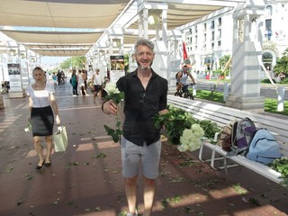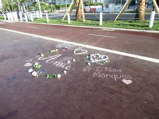 Spira una leggera brezza da ovest, come un anno fa, a Nizza e gli aerei, per atterrare, sorvolano, come allora, la Promenade. La città è silenziosa, tacciono le musiche dei ristoranti, i turisti percorrono la Promenade con una rosa bianca in mano, offerta da gruppi di volontari, e vanno a deporla in vari punti della passeggiata, davanti alla foto di una persona uccisa, nei punti dove il dramma si è trasformato in morte, sui disegni che sono stati tracciati sul marciapiede.
