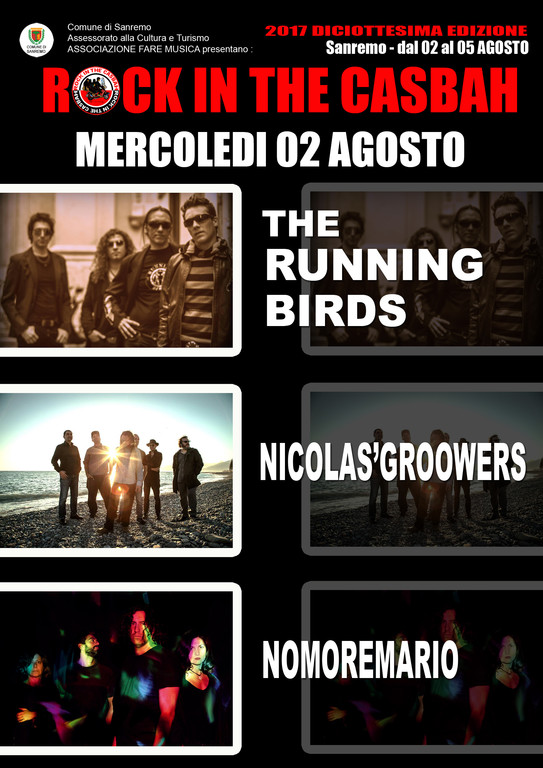 Finale di serata per festeggiare i 25 anni di attività dei Running Birds, forse i rocker più puri, sempre fedeli nel corso dei loro anni di attività alla loro cifra stilistica che parte dall’hard rock. Eccelsi musicisti protagonisti di collaborazioni di grande spessore (Ian Paice batteria dei Deep Purple) che ha affiancato sul palco vere colonne del genere come gli Status Quo, Scorpinos, ZZ Top, Deep Purple. Per festeggiare il venticinquesimo anno di attività sul palco di Rock in The Casbah la Band ospiterà lo storico cantante della seconda formazione : Krees Moretti.