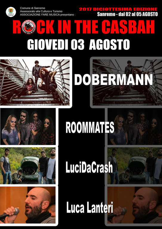 Chiudono la seconda serata i torinesi Dobermann, alla seconda partecipazione a Rock in The Casbah. Una vera live band, creatasi esattamente nell’esperienza di palco di tre rocker purosangue già protagonisti di illustrissime collaborazioni internazionali. Sarà questa una vera e propria esplosione, un momento infuocato nel vero senso della parola. Di estrazione purissima, si muovono tra influenze Ac/Dc-Van Halen ed il primo Punk secco dei Police. Nell’estate 2016 registrano il loro Ep con la produzione di Fabio Trentini (Guano Apes).