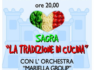 “La tradizione in cucina” è per tutti gli amanti dei sapori tradizionali, con prodotti tipici e i piatti preparati “come una volta”. Si potranno gustare: ravioli boraggine, gnocchi patate, capra e fagioli, rostelle, carne alla brace, salsiccia, patatine, condiglione, anguria, e sarà a disposizione un servizio bar completo. Entrambe le serate saranno in compagnia dell'orchestra "Mariella Group" che a partire dalle 21 circa intratterrà il pubblico con grandi successi di liscio, latino americano e anni ‘60-’70 e anni ’80. L'orchestra prende il nome dalla cantante principale, Mariella Vigna, professionista con esperienza trentennale.