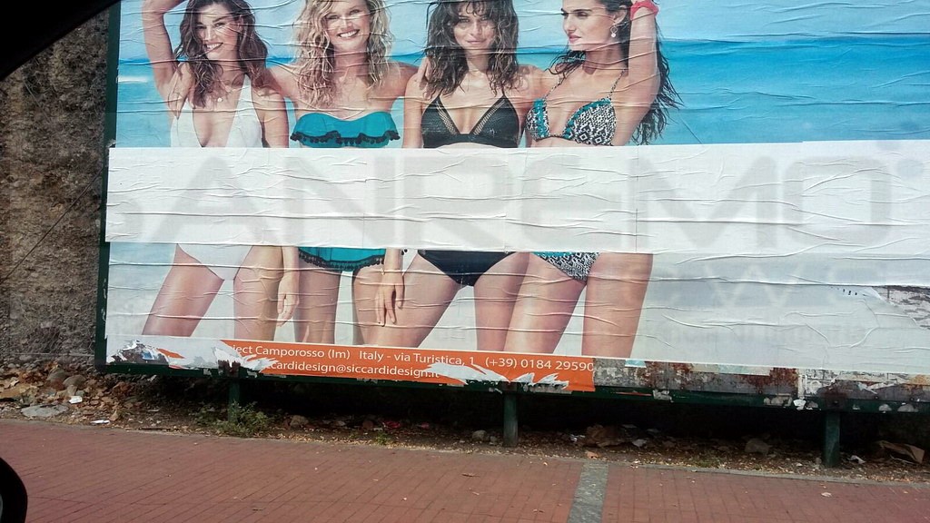 Stiamo parlando del grande manifesto 6x3, presente nella zona del Cimitero, nella frazione di Roverino a Ventimiglia. Un manifesto che ritrae 4 belle ragazze in bikini, proprio sulla strada che vede un grande transito di migranti tra il ‘Campo Roya’ e le Gianchette.