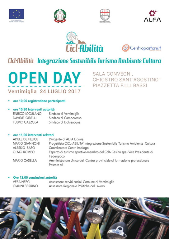 Lunedì 24 luglio nel salone del Chiostro di Sant’Agostino si terrà un open day sul progetto “Cicl-Abilità” che il Comune di Ventimiglia sta realizzando insieme ai Comuni di Camporosso e Dolceacqua e il Centro Pastore, capofila nell’organizzazione. L’operazione “CICL-ABILITÀ Integrazione sostenibile turismo-ambiente-cultura”, promosso dall’Assessore ai Servizi Sociali Vera Nesci, nasce con l’obiettivo di valorizzare le peculiarità della pista ciclabile del nostro territorio, che collega la linea di costa e i paesi dell’entroterra, in un percorso ricco di siti storico-culturali e bellezze naturali. Il progetto prevederà la progettazione e la realizzazione di attività sportive e ricreative, culturali ed enogastronomiche e la creazione di almeno tre punti lungo la pista, vere e proprie tappe per l’informazione e l’erogazione dei servizi, come il noleggio di biciclette.