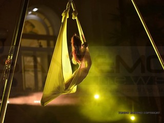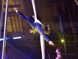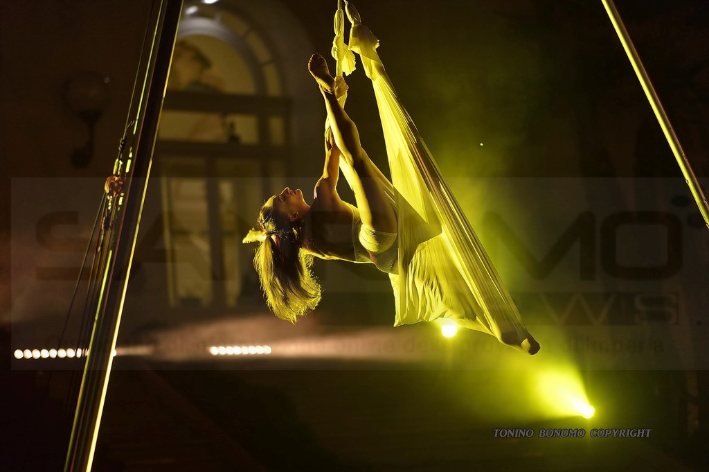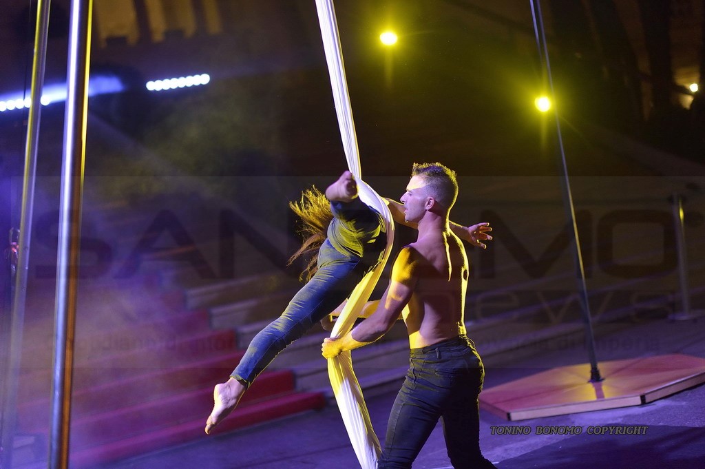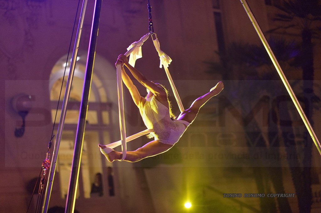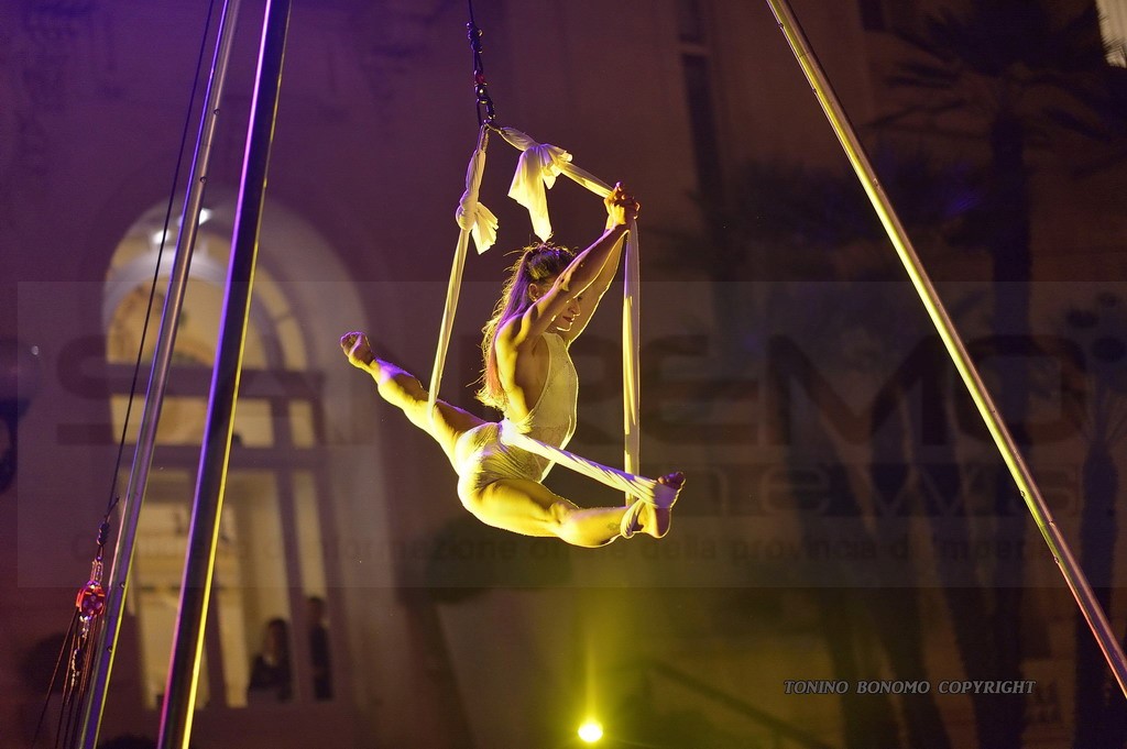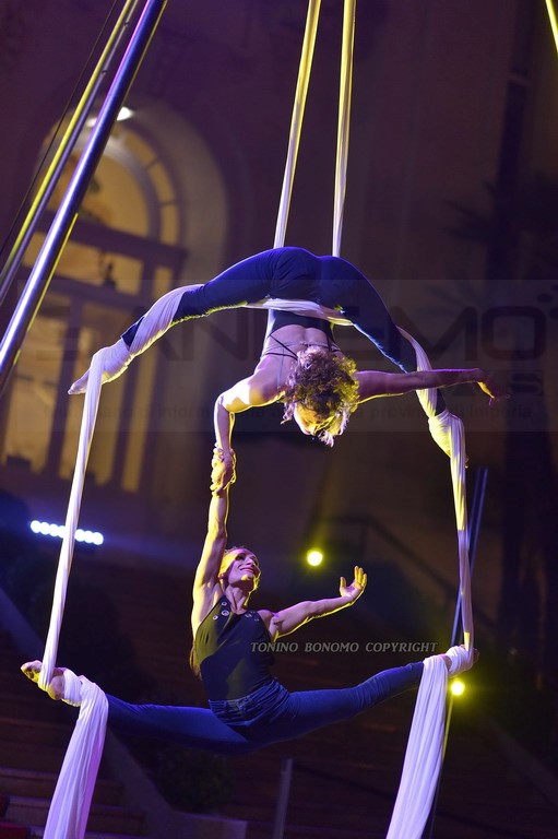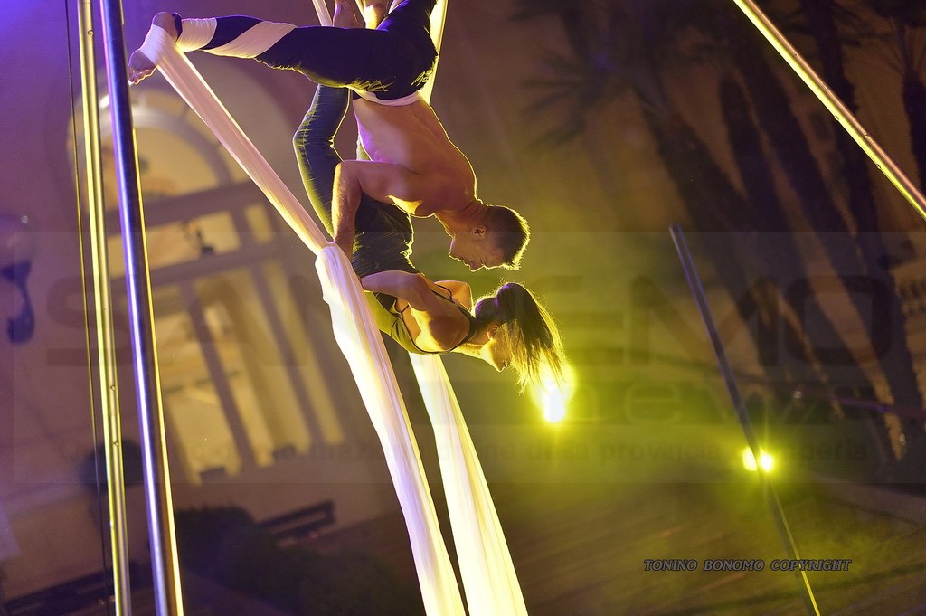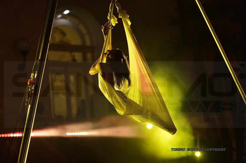 Lo spettacolo ha visto molti turisti e residenti osservare le evoluzioni, con i volteggi dei protagonisti sospesi nel vuoto, che hanno creato atmosfere di grande effetto a volte diventando una 'goccia' a volte fondendosi con i tessuti e poi volteggiando utilizzando la 'lira' accompagnati da musica intensa, un’esibizione dove la preparazione atletica si fodne con gli effetti di lce, musica e originalità delle figure e delle coreografie.