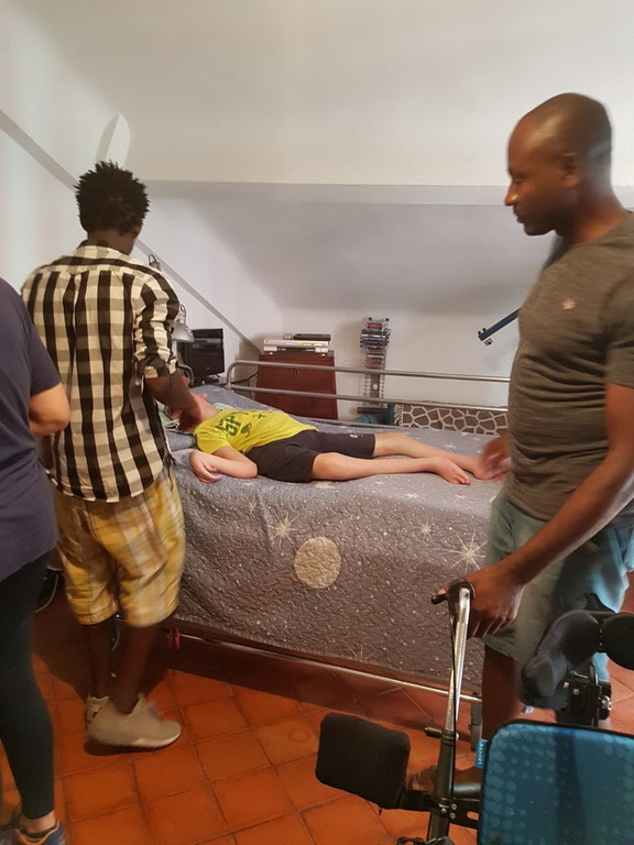Prima iniziativa a seguito del corso di accompagnamento disabili svoltosi ad inizio Luglio, organizzato da Cooperativa Ancora, l’Ass. Giraffa a Rotelle, Aifo e A.F.P.L, e finanziato da Cespim, presso i locali della cooperativa ‘L'Ancora’ nella sede di Oneglia. Due dei migranti che hanno partecipato al corso, Mussah e Paul, hanno iniziato da due settimane ad affiancare i professionisti che aiutano Matteo a frequentare la piscina e a svolgere esercizi di ginnastica. Continueranno questa attività, a titolo assolutamente e gratuito e volontario, per tutto il corso dell'estate.