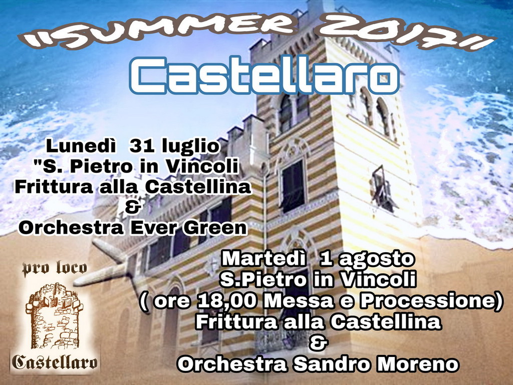 Il primo riguarda la festa patronale di San Pietro in Vincoli organizzata nelle serate di lunedì 31 luglio e martedì 1 agosto. L'evento si terrà, come sempre, nella piazza caratteristica del Castello. Il tema culinario è la frittura alla Castellina accompagnata da carne alla brace, buon vino e birra artigianale ‘Baladin’. Serate danzanti con le orchestre Ever Green il 31 e Sandro Moreno il 1° a partire dalle ore 20.00. Per chi volesse partecipare, il 1° agosto alle ore 18.00 sarà celebrata la messa di ricorrenza con processione per le vie del paese con la statua di San Pietro.