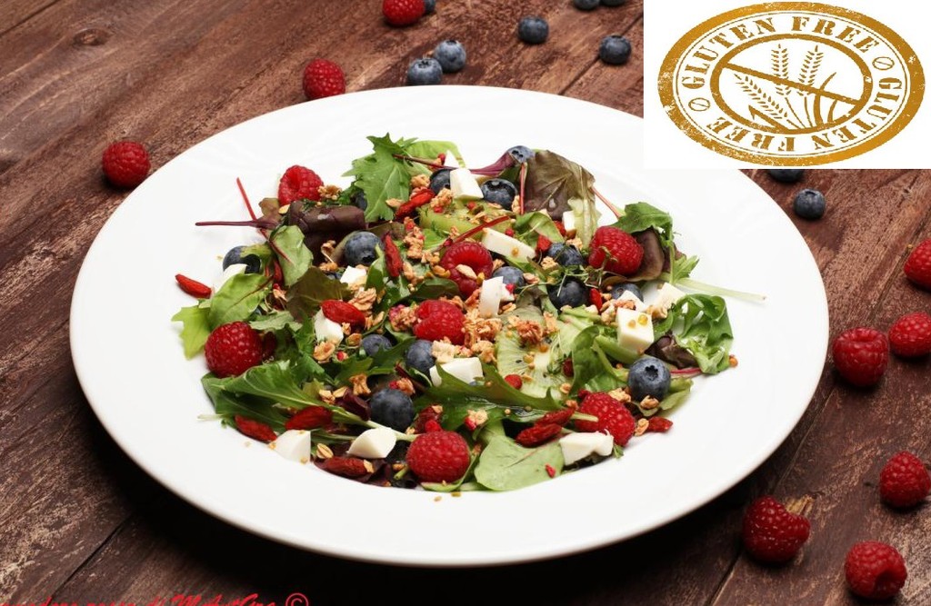 INSALATA MISTA CON MIRTILLI LAMPONI, SEMI DI CHIA, BACCHE DI GOJI E FETA