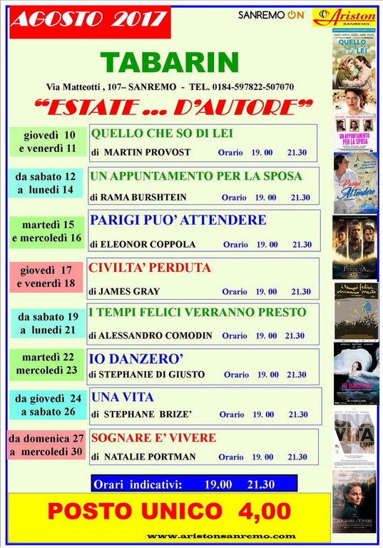 - al cinema Tabarin ‘Estate... d’autore’ con una rassegna di film d’essai che hanno partecipato a Venezia, Cannes riportando un buon successo.