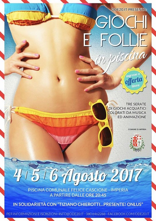 Giochi e follie in piscina! Tre serate di giochi acquatici, colorati da musica e animazione organizzati dall’associazione ‘Ode20’ col patrocinio del Comune di Imperia e la collaborzione della Rari Nantes.