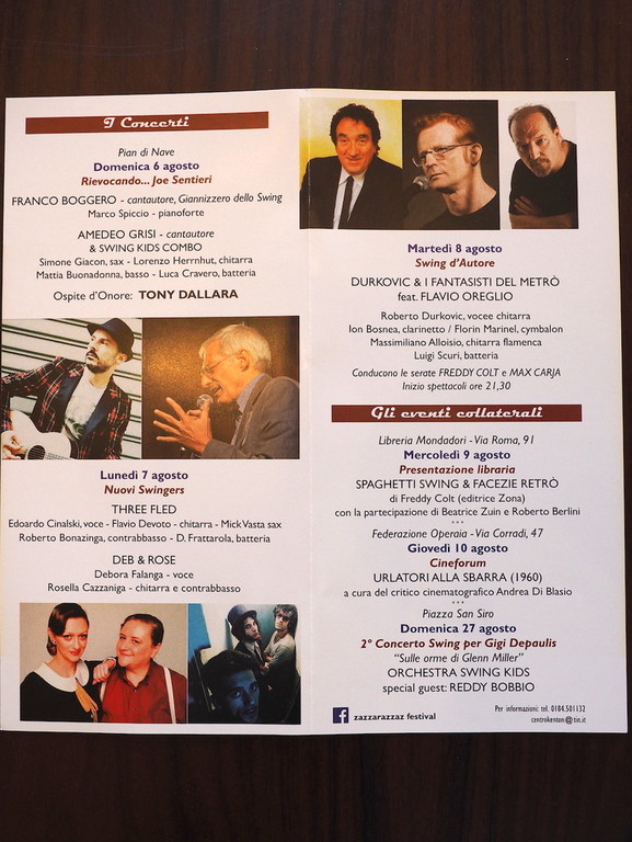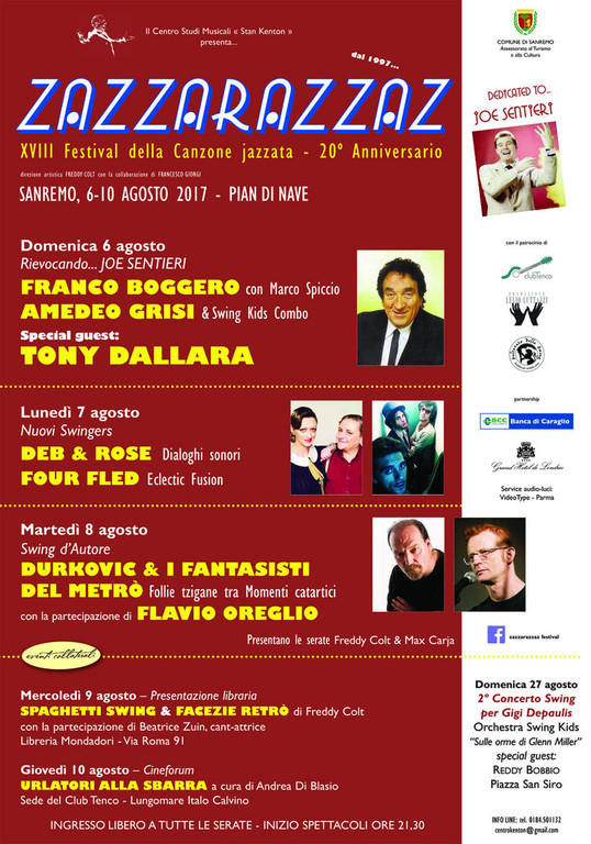 Tutto pronto per Zazzarazzaz, XVIIIº Festival della Canzone Jazzata in programma a Sanremo dal 6 all'8 agosto. Tre serate concerto a pian di nave e altrettanti eventi collaterali nel programma del tradizionale appuntamento estivo. Questa edizione sarà dedicata a Rino Joe Sentieri a 10 anni dalla sua scomparsa. L'organizzazione dell'evento è cura del centro studi musicali Stan Kenton, con la direzione artistica di Freddy Colt, la collaborazione di Francesco Giorgi e dell'assessorato al turismo del comune matuziano.