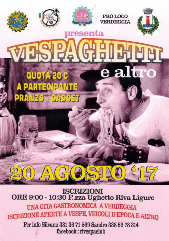 Domenica prossima, 20 agosto 2017, a Verdeggia (frazione di Triora) si terrà la manifestazione denominata Vespaghetti aperta a tutti i veicoli. Le iscrizioni si svolgeranno dalle ore 9.00 alle 10.30 in piazza Ughetto a Riva Ligure.