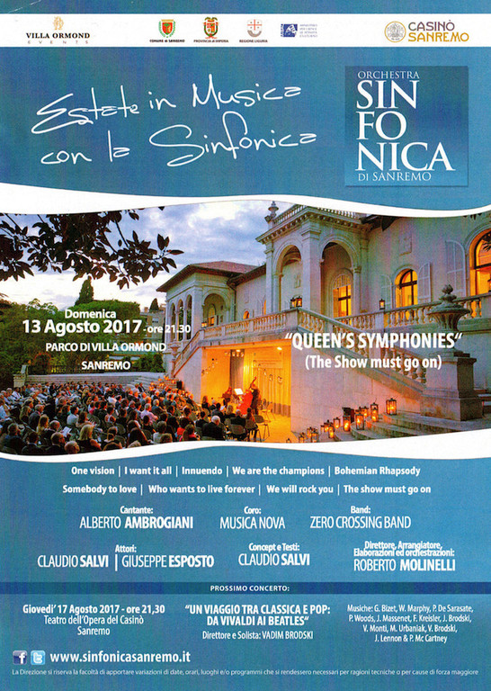 Il cantante solista Alberto Ambrogiani ha magistralmente interpretato il ruolo del leader dei Queen accompagnato dall’Orchestra Sinfonica di Sanremo e dal coro Musica Nova diretti dal Maestro Roberto Molinelli.