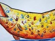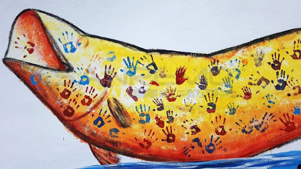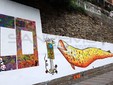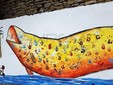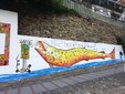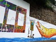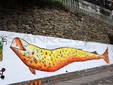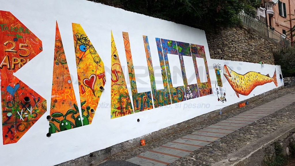 La scritta Badalucco salta subito agli occhi, così come lo stoccafisso e poi in cima, sul muro, la scultura, un gatto ribattezzato Andrea. I felini sono amati dall’artista ma sono anche i veri padroni dei carruggi di questo paesino. Questo variopinto disegno è stato fatto da Soriani ma al suo interno c’è anche la partecipazione di tanti abitanti di questo borgo della valle Argentina. In questi giorni, sono state tante le persone che hanno voluto mettere la propria firma su quell’opera, chi con una mano colorata e altri con una citazione o una frase.