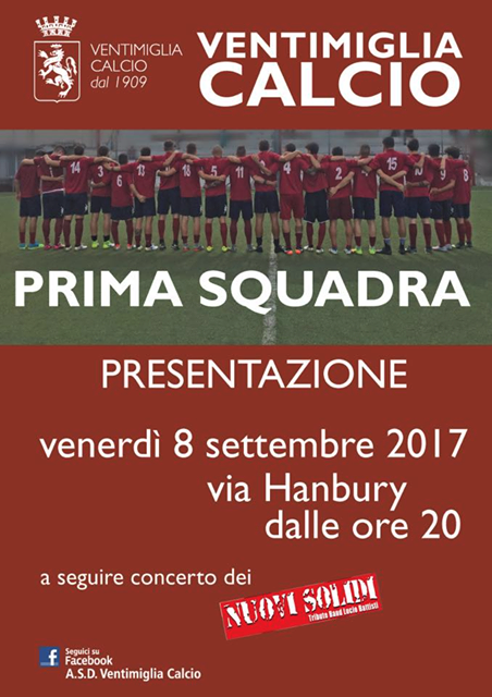 E' tutto pronto per la presentazione questa sera (l'appuntamento è per le ore 20.00) della Prima Squadra del Ventimiglia Calcio di mister Andrea Caverzan in via Hanbury nel cuore della città di confine.
