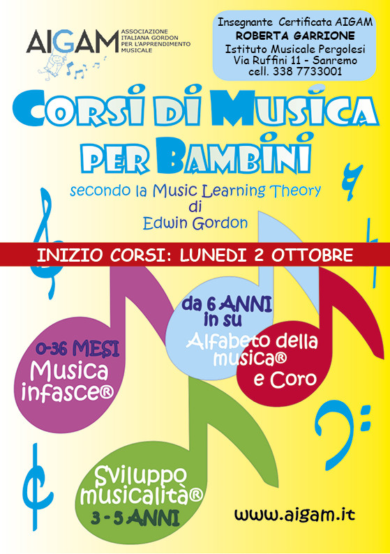 Grandi novità sono previste anche per i bambini, come il corso di percussioni BIM, BUM…DRUM!, rivolto ai bambini dai 5 agli 11 anni; il progetto “Musicainfasce”, per bambini da 0 a 36 mesi; “Sviluppomusicalità” dai 3 ai 5 anni; e per i più grandicelli, dai sei anni in su, l'Istituto Musicale propone “Alfabeto della Musica” e Coro Voci Bianche, quest'ultimo seguito sarà dalla Prof.ssa Roberta Garrione, Insegnante certificata AIGAM, secondo la Music Learning Theory di Edwin Gordon. Ultimo ma non ultimo anche i corsi collettivi di canto pop e chitarra.