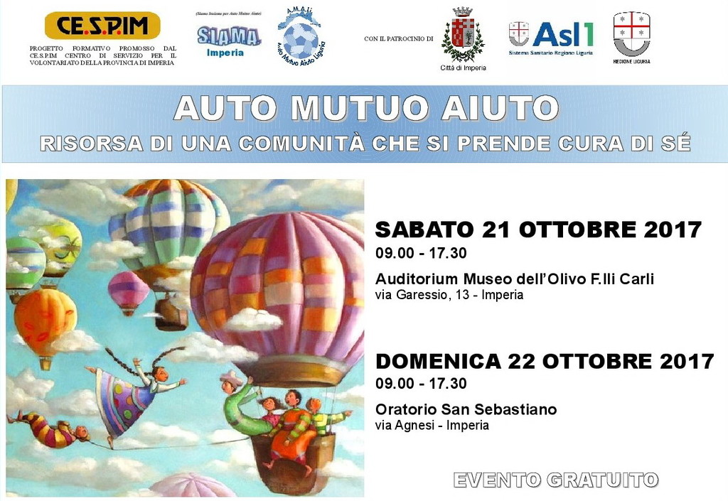 L’ evento è promosso dal CE.S.P.IM (Centro Servizi per il Volontariato della Provincia di Imperia) e organizzato dall’associazione di volontariato S.I.A.M.A. (Siamo Insieme per Auto Mutuo Aiuto), in collaborazione con A.M.A.Li (associazione di volontariato per il coordinamento dell’auto mutuo aiuto in Liguria) e con il patrocinio di Regione Liguria, Comune di Imperia e ASL 1 Imperiese. L’evento sarà guidato da uno dei maggiori esperti in Italia sull’Auto Mutuo Aiuto, nonché fondatore dell’A.M.A. di Trento e autore di diverse pubblicazioni, il dott. Stefano Bertoldi e che, grazie al contributo del CE.S.P.IM, sarà per tutti gratuito.