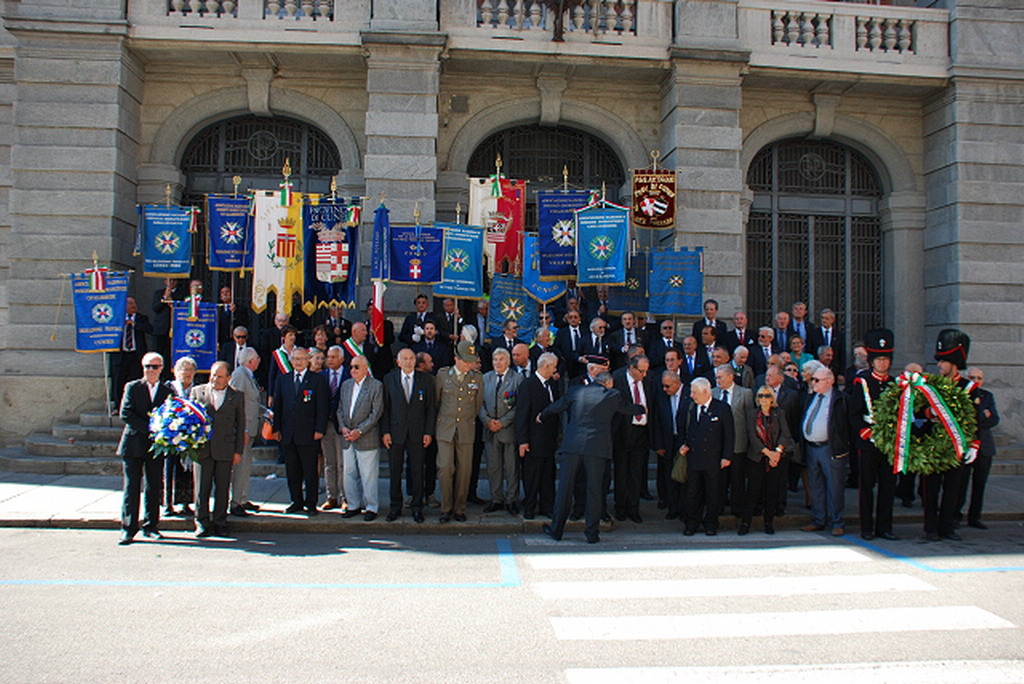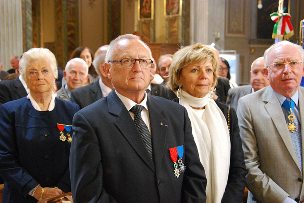 Al termine della Santa Messa, si è formato un corteo per recarsi al monumento nei Giardini Fresia per rendere onore ai Caduti per la Patria, dove accompagnate dalle note del Piave, dell’inno di Mameli e della Marsigliese, sono state deposte una corona di alloro dono degli Insigniti Italiani ed un cuscino di fiori da parte degli Insigniti francesi .